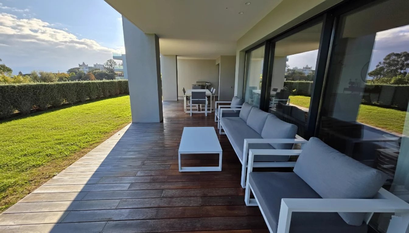 The apartment comprises an entrance hall leading to a bright living and dining area with a fully equipped open-plan kitchen, a master bedroom with en-suite bathroom and dressing room, as well as two additional bedrooms and two independent bathrooms.
