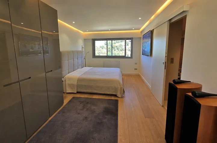 Le vaste séjour, baigné de lumière grâce à ses larges baies vitrées panoramiques, s’ouvre sur une superbe terrasse offrant une vue imprenable sur la mer Méditerranée. La cuisine ouverte, au design contemporain et épuré, s’intègre harmonieusement à l’espace de vie, créant une atmosphère raffinée et élégante.
