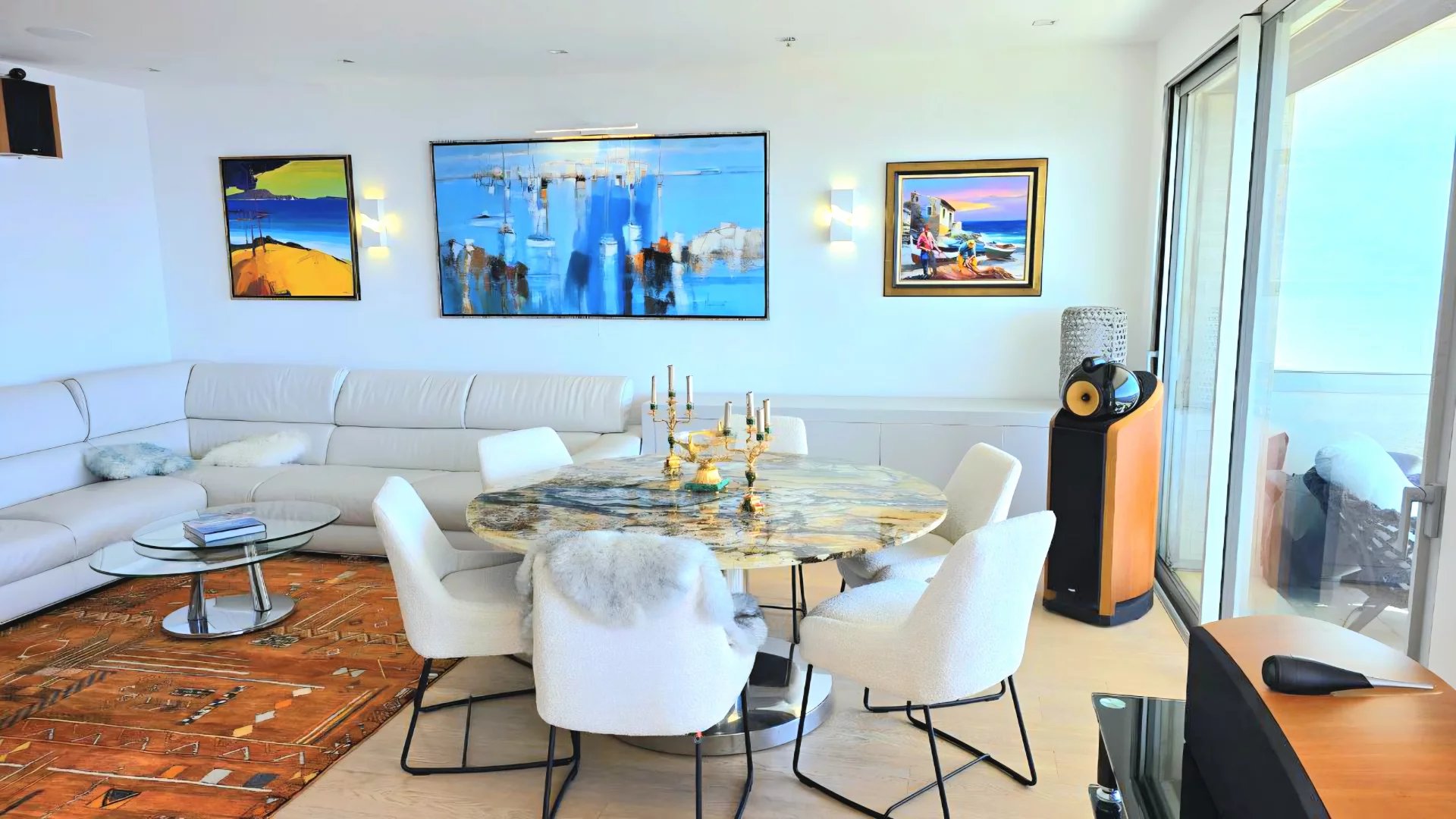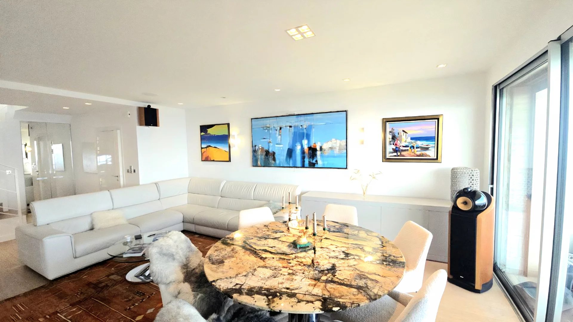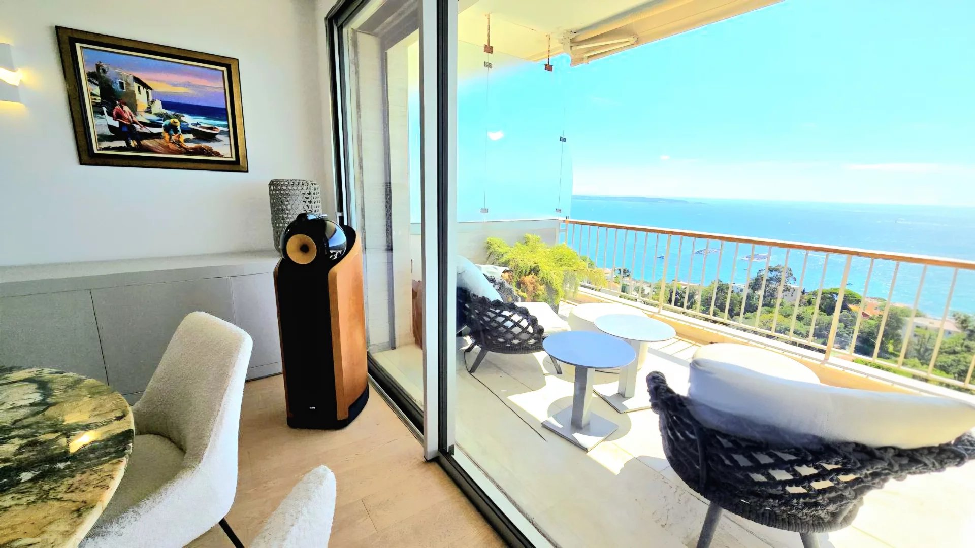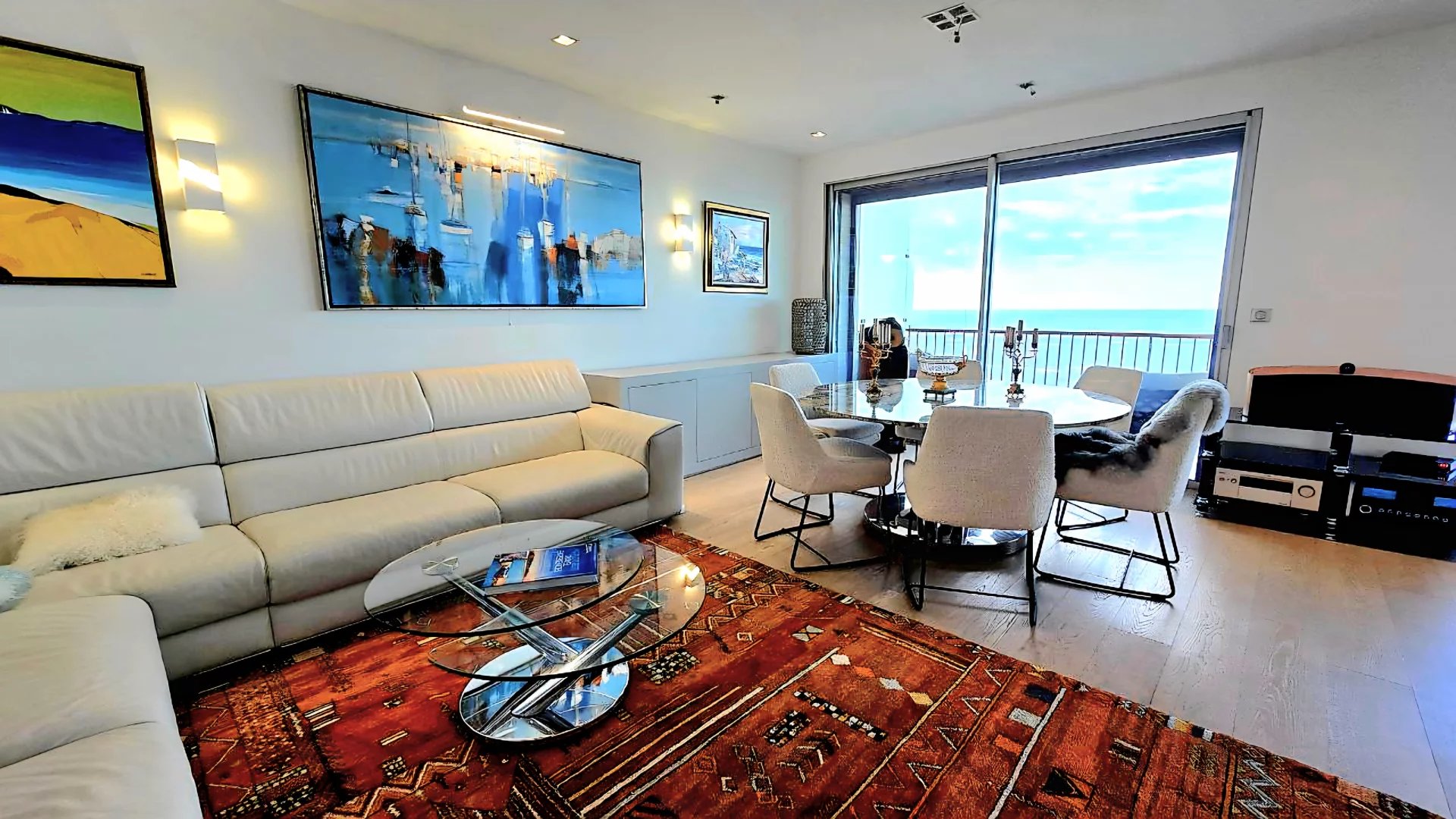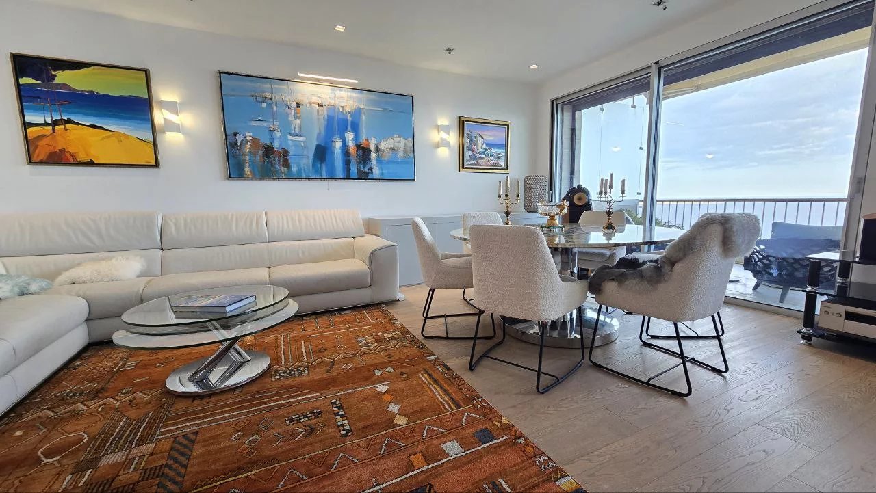 Le vaste séjour, baigné de lumière grâce à ses larges baies vitrées panoramiques, s’ouvre sur une superbe terrasse offrant une vue imprenable sur la mer Méditerranée. La cuisine ouverte, au design contemporain et épuré, s’intègre harmonieusement à l’espace de vie, créant une atmosphère raffinée et élégante.