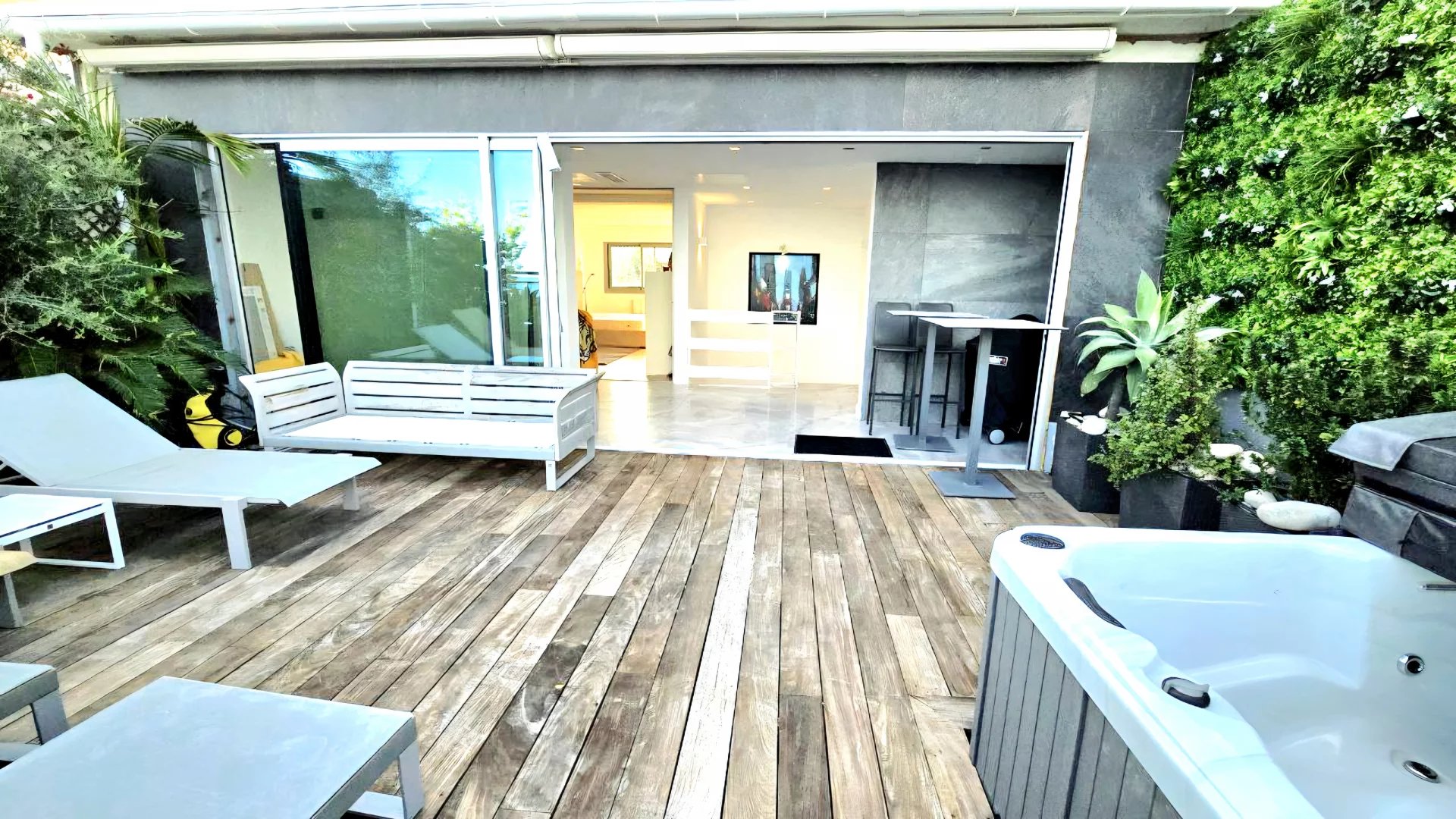 L’étage supérieur est entièrement dédié à la suite parentale, véritable havre de paix avec salle de bains privative et accès direct à une magnifique terrasse en bois équipée d’un jacuzzi. L’absence totale de vis-à-vis garantit une intimité et une tranquillité absolues.